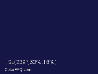 HSL 239°,53%,18% Color is a very dark blue color and the nearest color is Bunting #151f4c. Hex code #161646 and RGB value is rgb(22,22,70). In RGB color space, this color is composed of 9% red, 9% green, 27% blue, In CMYK color space, this color is composed of 69% cyan, 69% magenta, 0% yellow , 73% black , In HSL color space, this color has a hue angle of 239° , 53% saturation and 18% lightness.