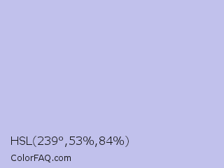 HSL 239°,53%,84% Color is a very light blue color and the nearest color is Periwinkle Gray #c3cde6. Hex code #c1c1ec and RGB value is rgb(193,193,236). In RGB color space, this color is composed of 76% red, 76% green, 93% blue, In CMYK color space, this color is composed of 18% cyan, 18% magenta, 0% yellow , 7% black , In HSL color space, this color has a hue angle of 239° , 53% saturation and 84% lightness.