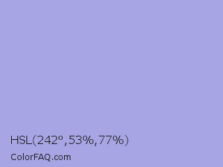 HSL 242°,53%,77% Color is a light indigo color and the nearest color is Maximum Blue Purple #acace6. Hex code #a7a5e3 and RGB value is rgb(167,165,227). In RGB color space, this color is composed of 65% red, 65% green, 89% blue, In CMYK color space, this color is composed of 26% cyan, 27% magenta, 0% yellow , 11% black , In HSL color space, this color has a hue angle of 242° , 53% saturation and 77% lightness.