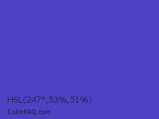 HSL 247°,53%,51% Color is a normal indigo color and the nearest color is Ocean Blue #4f42b5. Hex code #4f40c4 and RGB value is rgb(79,64,196). In RGB color space, this color is composed of 31% red, 25% green, 77% blue, In CMYK color space, this color is composed of 60% cyan, 67% magenta, 0% yellow , 23% black , In HSL color space, this color has a hue angle of 247° , 53% saturation and 51% lightness.