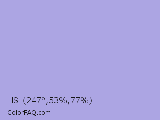 HSL 247°,53%,77% Color is a light indigo color and the nearest color is Maximum Blue Purple #acace6. Hex code #aca5e3 and RGB value is rgb(172,165,227). In RGB color space, this color is composed of 67% red, 65% green, 89% blue, In CMYK color space, this color is composed of 24% cyan, 27% magenta, 0% yellow , 11% black , In HSL color space, this color has a hue angle of 247° , 53% saturation and 77% lightness.
