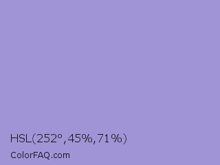HSL 252°,45%,71% Color is a light indigo color and the nearest color is Blue Bell Crayola #9999cc. Hex code #a194d6 and RGB value is rgb(161,148,214). In RGB color space, this color is composed of 63% red, 58% green, 84% blue, In CMYK color space, this color is composed of 25% cyan, 31% magenta, 0% yellow , 16% black , In HSL color space, this color has a hue angle of 252° , 45% saturation and 71% lightness.