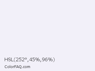 HSL 252°,45%,96% Color is a almost white indigo color and the nearest color is Selago #f0eefd. Hex code #f2f0f9 and RGB value is rgb(242,240,249). In RGB color space, this color is composed of 95% red, 94% green, 98% blue, In CMYK color space, this color is composed of 3% cyan, 4% magenta, 0% yellow , 2% black , In HSL color space, this color has a hue angle of 252° , 45% saturation and 96% lightness.