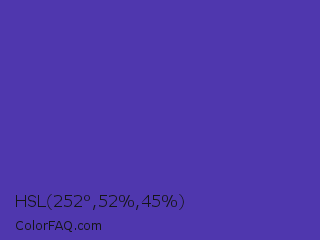 HSL 252°,52%,45% Color is a normal indigo color and the nearest color is Ocean Blue #4f42b5. Hex code #4f37ae and RGB value is rgb(79,55,174). In RGB color space, this color is composed of 31% red, 22% green, 68% blue, In CMYK color space, this color is composed of 55% cyan, 68% magenta, 0% yellow , 32% black , In HSL color space, this color has a hue angle of 252° , 52% saturation and 45% lightness.