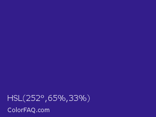 HSL 252°,65%,33% Color is a normal indigo color and the nearest color is Pixie Powder #391285. Hex code #331d8b and RGB value is rgb(51,29,139). In RGB color space, this color is composed of 20% red, 11% green, 55% blue, In CMYK color space, this color is composed of 63% cyan, 79% magenta, 0% yellow , 45% black , In HSL color space, this color has a hue angle of 252° , 65% saturation and 33% lightness.