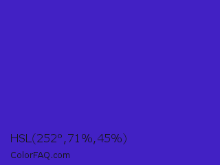 HSL 252°,71%,45% Color is a normal indigo color and the nearest color is Interdimensional Blue #360ccc. Hex code #4221c4 and RGB value is rgb(66,33,196). In RGB color space, this color is composed of 26% red, 13% green, 77% blue, In CMYK color space, this color is composed of 66% cyan, 83% magenta, 0% yellow , 23% black , In HSL color space, this color has a hue angle of 252° , 71% saturation and 45% lightness.