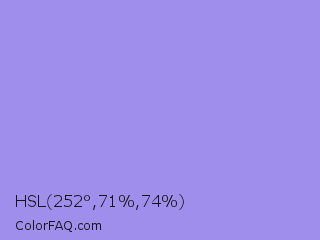 HSL 252°,71%,74% Color is a light indigo color and the nearest color is Dull Lavender #a899e6. Hex code #a08eec and RGB value is rgb(160,142,236). In RGB color space, this color is composed of 63% red, 56% green, 93% blue, In CMYK color space, this color is composed of 32% cyan, 40% magenta, 0% yellow , 7% black , In HSL color space, this color has a hue angle of 252° , 71% saturation and 74% lightness.