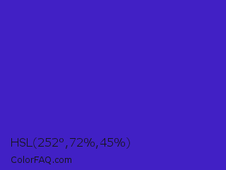 HSL 252°,72%,45% Color is a normal indigo color and the nearest color is Interdimensional Blue #360ccc. Hex code #4120c5 and RGB value is rgb(65,32,197). In RGB color space, this color is composed of 25% red, 13% green, 77% blue, In CMYK color space, this color is composed of 67% cyan, 84% magenta, 0% yellow , 23% black , In HSL color space, this color has a hue angle of 252° , 72% saturation and 45% lightness.