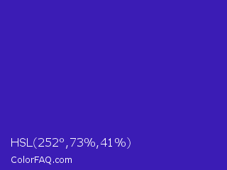 HSL 252°,73%,41% Color is a normal indigo color and the nearest color is Interdimensional Blue #360ccc. Hex code #3b1cb5 and RGB value is rgb(59,28,181). In RGB color space, this color is composed of 23% red, 11% green, 71% blue, In CMYK color space, this color is composed of 67% cyan, 85% magenta, 0% yellow , 29% black , In HSL color space, this color has a hue angle of 252° , 73% saturation and 41% lightness.