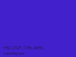 HSL 252°,73%,46% Color is a normal indigo color and the nearest color is Interdimensional Blue #360ccc. Hex code #4220cb and RGB value is rgb(66,32,203). In RGB color space, this color is composed of 26% red, 13% green, 80% blue, In CMYK color space, this color is composed of 67% cyan, 84% magenta, 0% yellow , 20% black , In HSL color space, this color has a hue angle of 252° , 73% saturation and 46% lightness.