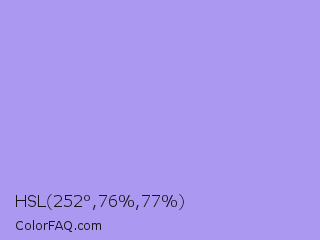 HSL 252°,76%,77% Color is a light indigo color and the nearest color is Dull Lavender #a899e6. Hex code #aa98f1 and RGB value is rgb(170,152,241). In RGB color space, this color is composed of 67% red, 60% green, 95% blue, In CMYK color space, this color is composed of 29% cyan, 37% magenta, 0% yellow , 5% black , In HSL color space, this color has a hue angle of 252° , 76% saturation and 77% lightness.