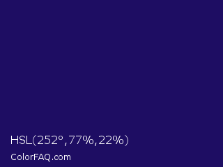 HSL 252°,77%,22% Color is a very dark indigo color and the nearest color is Violent Violet #290c5e. Hex code #1e0d63 and RGB value is rgb(30,13,99). In RGB color space, this color is composed of 12% red, 5% green, 39% blue, In CMYK color space, this color is composed of 70% cyan, 87% magenta, 0% yellow , 61% black , In HSL color space, this color has a hue angle of 252° , 77% saturation and 22% lightness.