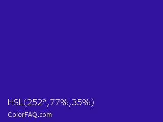 HSL 252°,77%,35% Color is a normal indigo color and the nearest color is Blue Gem #2c0e8c. Hex code #30149e and RGB value is rgb(48,20,158). In RGB color space, this color is composed of 19% red, 8% green, 62% blue, In CMYK color space, this color is composed of 70% cyan, 87% magenta, 0% yellow , 38% black , In HSL color space, this color has a hue angle of 252° , 77% saturation and 35% lightness.
