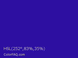 HSL 252°,83%,35% Color is a normal indigo color and the nearest color is Blue Gem #2c0e8c. Hex code #2d0fa3 and RGB value is rgb(45,15,163). In RGB color space, this color is composed of 18% red, 6% green, 64% blue, In CMYK color space, this color is composed of 72% cyan, 91% magenta, 0% yellow , 36% black , In HSL color space, this color has a hue angle of 252° , 83% saturation and 35% lightness.