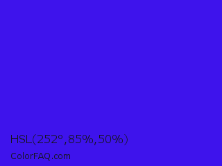 HSL 252°,85%,50% Color is a normal indigo color and the nearest color is Han Purple #5218fa. Hex code #3e13ec and RGB value is rgb(62,19,236). In RGB color space, this color is composed of 24% red, 7% green, 93% blue, In CMYK color space, this color is composed of 74% cyan, 92% magenta, 0% yellow , 7% black , In HSL color space, this color has a hue angle of 252° , 85% saturation and 50% lightness.
