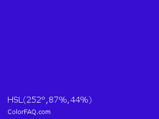HSL 252°,87%,44% Color is a normal indigo color and the nearest color is Interdimensional Blue #360ccc. Hex code #360fd2 and RGB value is rgb(54,15,210). In RGB color space, this color is composed of 21% red, 6% green, 82% blue, In CMYK color space, this color is composed of 74% cyan, 93% magenta, 0% yellow , 18% black , In HSL color space, this color has a hue angle of 252° , 87% saturation and 44% lightness.