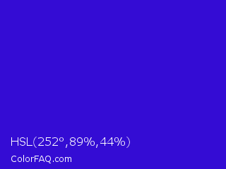 HSL 252°,89%,44% Color is a normal indigo color and the nearest color is Interdimensional Blue #360ccc. Hex code #340cd4 and RGB value is rgb(52,12,212). In RGB color space, this color is composed of 20% red, 5% green, 83% blue, In CMYK color space, this color is composed of 75% cyan, 94% magenta, 0% yellow , 17% black , In HSL color space, this color has a hue angle of 252° , 89% saturation and 44% lightness.