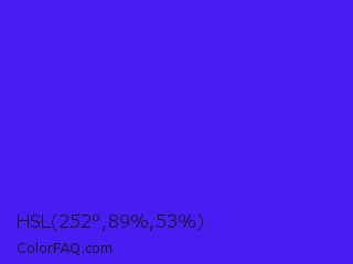 HSL 252°,89%,53% Color is a normal indigo color and the nearest color is Han Purple #5218fa. Hex code #471df2 and RGB value is rgb(71,29,242). In RGB color space, this color is composed of 28% red, 11% green, 95% blue, In CMYK color space, this color is composed of 71% cyan, 88% magenta, 0% yellow , 5% black , In HSL color space, this color has a hue angle of 252° , 89% saturation and 53% lightness.
