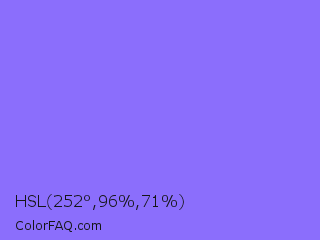HSL 252°,96%,71% Color is a light indigo color and the nearest color is Medium Slate Blue #7b68ee. Hex code #8b6efc and RGB value is rgb(139,110,252). In RGB color space, this color is composed of 55% red, 43% green, 99% blue, In CMYK color space, this color is composed of 45% cyan, 56% magenta, 0% yellow , 1% black , In HSL color space, this color has a hue angle of 252° , 96% saturation and 71% lightness.