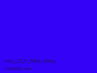 HSL 252°,98%,49% Color is a normal indigo color and the nearest color is Electric Ultramarine #3f00ff. Hex code #3403f7 and RGB value is rgb(52,3,247). In RGB color space, this color is composed of 20% red, 1% green, 97% blue, In CMYK color space, this color is composed of 79% cyan, 99% magenta, 0% yellow , 3% black , In HSL color space, this color has a hue angle of 252° , 98% saturation and 49% lightness.