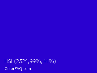 HSL 252°,99%,41% Color is a normal indigo color and the nearest color is Interdimensional Blue #360ccc. Hex code #2a01d0 and RGB value is rgb(42,1,208). In RGB color space, this color is composed of 16% red, 0% green, 82% blue, In CMYK color space, this color is composed of 80% cyan, 100% magenta, 0% yellow , 18% black , In HSL color space, this color has a hue angle of 252° , 99% saturation and 41% lightness.