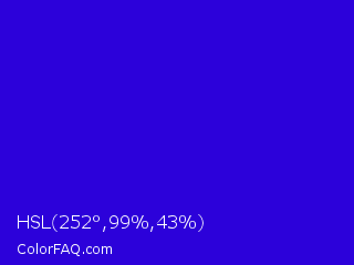 HSL 252°,99%,43% Color is a normal indigo color and the nearest color is Interdimensional Blue #360ccc. Hex code #2c01da and RGB value is rgb(44,1,218). In RGB color space, this color is composed of 17% red, 0% green, 85% blue, In CMYK color space, this color is composed of 80% cyan, 100% magenta, 0% yellow , 15% black , In HSL color space, this color has a hue angle of 252° , 99% saturation and 43% lightness.