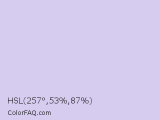 HSL 257°,53%,87% Color is a very light indigo color and the nearest color is Moon Raker #d6cef6. Hex code #d6ccef and RGB value is rgb(214,204,239). In RGB color space, this color is composed of 84% red, 80% green, 94% blue, In CMYK color space, this color is composed of 10% cyan, 15% magenta, 0% yellow , 6% black , In HSL color space, this color has a hue angle of 257° , 53% saturation and 87% lightness.