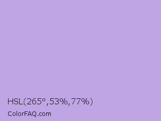 HSL 265°,53%,77% Color is a light violet color and the nearest color is Light Wisteria #c9a0dc. Hex code #bfa5e3 and RGB value is rgb(191,165,227). In RGB color space, this color is composed of 75% red, 65% green, 89% blue, In CMYK color space, this color is composed of 16% cyan, 27% magenta, 0% yellow , 11% black , In HSL color space, this color has a hue angle of 265° , 53% saturation and 77% lightness.