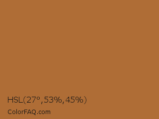 HSL 27°,53%,45% Color is a normal orange color and the nearest color is Copper #b87333. Hex code #af6d36 and RGB value is rgb(175,109,54). In RGB color space, this color is composed of 69% red, 43% green, 21% blue, In CMYK color space, this color is composed of 0% cyan, 38% magenta, 69% yellow , 31% black , In HSL color space, this color has a hue angle of 27° , 53% saturation and 45% lightness.