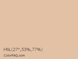 HSL 27°,53%,77% Color is a light orange color and the nearest color is Cashmere #e6bea5. Hex code #e3c1a5 and RGB value is rgb(227,193,165). In RGB color space, this color is composed of 89% red, 76% green, 65% blue, In CMYK color space, this color is composed of 0% cyan, 15% magenta, 27% yellow , 11% black , In HSL color space, this color has a hue angle of 27° , 53% saturation and 77% lightness.