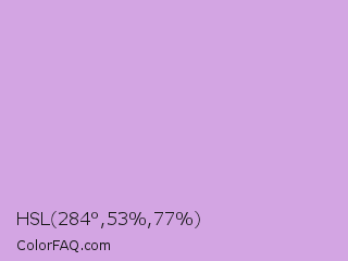 HSL 284°,53%,77% Color is a light purple color and the nearest color is Tropical Violet #cda4de. Hex code #d3a5e3 and RGB value is rgb(211,165,227). In RGB color space, this color is composed of 83% red, 65% green, 89% blue, In CMYK color space, this color is composed of 7% cyan, 27% magenta, 0% yellow , 11% black , In HSL color space, this color has a hue angle of 284° , 53% saturation and 77% lightness.