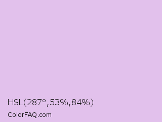 HSL 287°,53%,84% Color is a very light purple color and the nearest color is French Lilac #ecc7ee. Hex code #e2c1ec and RGB value is rgb(226,193,236). In RGB color space, this color is composed of 89% red, 76% green, 93% blue, In CMYK color space, this color is composed of 4% cyan, 18% magenta, 0% yellow , 7% black , In HSL color space, this color has a hue angle of 287° , 53% saturation and 84% lightness.