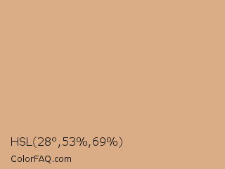 HSL 28°,53%,69% Color is a light orange color and the nearest color is Tumbleweed #deaa88. Hex code #daad86 and RGB value is rgb(218,173,134). In RGB color space, this color is composed of 85% red, 68% green, 53% blue, In CMYK color space, this color is composed of 0% cyan, 21% magenta, 39% yellow , 15% black , In HSL color space, this color has a hue angle of 28° , 53% saturation and 69% lightness.