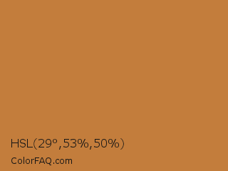 HSL 29°,53%,50% Color is a normal orange color and the nearest color is Peru #cd853f. Hex code #c37d3c and RGB value is rgb(195,125,60). In RGB color space, this color is composed of 76% red, 49% green, 24% blue, In CMYK color space, this color is composed of 0% cyan, 36% magenta, 69% yellow , 24% black , In HSL color space, this color has a hue angle of 29° , 53% saturation and 50% lightness.