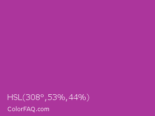 HSL 308°,53%,44% Color is a normal magenta color and the nearest color is Byzantine #bd33a4. Hex code #ac359c and RGB value is rgb(172,53,156). In RGB color space, this color is composed of 67% red, 21% green, 61% blue, In CMYK color space, this color is composed of 0% cyan, 69% magenta, 9% yellow , 33% black , In HSL color space, this color has a hue angle of 308° , 53% saturation and 44% lightness.