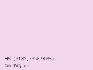 HSL 318°,53%,90% Color is a very light magenta color and the nearest color is Cherub #f8d9e9. Hex code #f3d8eb and RGB value is rgb(243,216,235). In RGB color space, this color is composed of 95% red, 85% green, 92% blue, In CMYK color space, this color is composed of 0% cyan, 11% magenta, 3% yellow , 5% black , In HSL color space, this color has a hue angle of 318° , 53% saturation and 90% lightness.