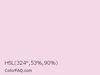 HSL 324°,53%,90% Color is a very light magenta color and the nearest color is Cherub #f8d9e9. Hex code #f3d8e8 and RGB value is rgb(243,216,232). In RGB color space, this color is composed of 95% red, 85% green, 91% blue, In CMYK color space, this color is composed of 0% cyan, 11% magenta, 5% yellow , 5% black , In HSL color space, this color has a hue angle of 324° , 53% saturation and 90% lightness.