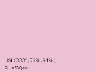 HSL 333°,53%,84% Color is a very light rose color and the nearest color is Melanie #e4c2d5. Hex code #ecc1d4 and RGB value is rgb(236,193,212). In RGB color space, this color is composed of 93% red, 76% green, 83% blue, In CMYK color space, this color is composed of 0% cyan, 18% magenta, 10% yellow , 7% black , In HSL color space, this color has a hue angle of 333° , 53% saturation and 84% lightness.