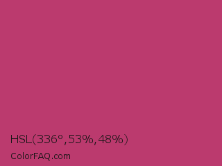 HSL 336°,53%,48% Color is a normal rose color and the nearest color is Hibiscus #b6316c. Hex code #bb3a6e and RGB value is rgb(187,58,110). In RGB color space, this color is composed of 73% red, 23% green, 43% blue, In CMYK color space, this color is composed of 0% cyan, 69% magenta, 41% yellow , 27% black , In HSL color space, this color has a hue angle of 336° , 53% saturation and 48% lightness.