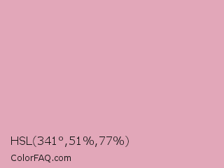 HSL 341°,51%,77% Color is a light rose color and the nearest color is Pale Chestnut #ddadaf. Hex code #e2a7b9 and RGB value is rgb(226,167,185). In RGB color space, this color is composed of 89% red, 65% green, 73% blue, In CMYK color space, this color is composed of 0% cyan, 26% magenta, 18% yellow , 11% black , In HSL color space, this color has a hue angle of 341° , 51% saturation and 77% lightness.