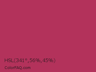 HSL 341°,56%,45% Color is a normal rose color and the nearest color is Rich Maroon #b03060. Hex code #b3325b and RGB value is rgb(179,50,91). In RGB color space, this color is composed of 70% red, 20% green, 36% blue, In CMYK color space, this color is composed of 0% cyan, 72% magenta, 49% yellow , 30% black , In HSL color space, this color has a hue angle of 341° , 56% saturation and 45% lightness.