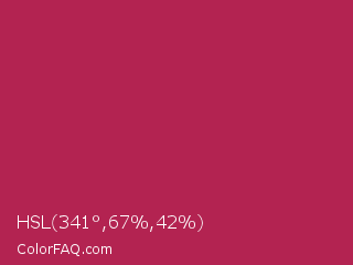 HSL 341°,67%,42% Color is a normal rose color and the nearest color is Amaranth Purple #ab274f. Hex code #b32351 and RGB value is rgb(179,35,81). In RGB color space, this color is composed of 70% red, 14% green, 32% blue, In CMYK color space, this color is composed of 0% cyan, 80% magenta, 55% yellow , 30% black , In HSL color space, this color has a hue angle of 341° , 67% saturation and 42% lightness.