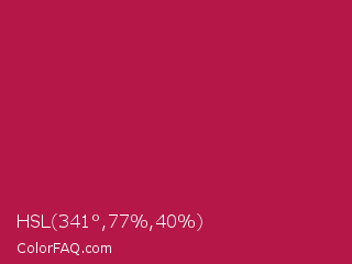 HSL 341°,77%,40% Color is a normal rose color and the nearest color is French Wine #ac1e44. Hex code #b51749 and RGB value is rgb(181,23,73). In RGB color space, this color is composed of 71% red, 9% green, 29% blue, In CMYK color space, this color is composed of 0% cyan, 87% magenta, 60% yellow , 29% black , In HSL color space, this color has a hue angle of 341° , 77% saturation and 40% lightness.