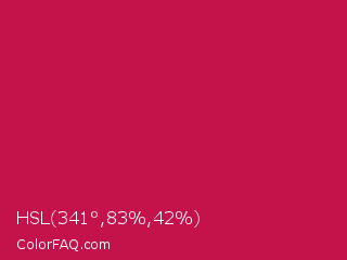HSL 341°,83%,42% Color is a normal rose color and the nearest color is Pictorial Carmine #c30b4e. Hex code #c4124a and RGB value is rgb(196,18,74). In RGB color space, this color is composed of 77% red, 7% green, 29% blue, In CMYK color space, this color is composed of 0% cyan, 91% magenta, 62% yellow , 23% black , In HSL color space, this color has a hue angle of 341° , 83% saturation and 42% lightness.