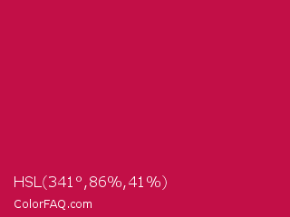 HSL 341°,86%,41% Color is a normal rose color and the nearest color is Pictorial Carmine #c30b4e. Hex code #c20f47 and RGB value is rgb(194,15,71). In RGB color space, this color is composed of 76% red, 6% green, 28% blue, In CMYK color space, this color is composed of 0% cyan, 92% magenta, 63% yellow , 24% black , In HSL color space, this color has a hue angle of 341° , 86% saturation and 41% lightness.