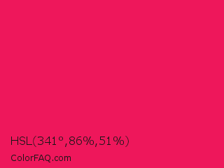 HSL 341°,86%,51% Color is a normal rose color and the nearest color is Ruby #e0115f. Hex code #ee175b and RGB value is rgb(238,23,91). In RGB color space, this color is composed of 93% red, 9% green, 36% blue, In CMYK color space, this color is composed of 0% cyan, 90% magenta, 62% yellow , 7% black , In HSL color space, this color has a hue angle of 341° , 86% saturation and 51% lightness.