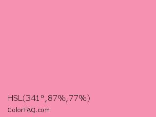 HSL 341°,87%,77% Color is a light rose color and the nearest color is Flamingo Pink #fc8eac. Hex code #f791b2 and RGB value is rgb(247,145,178). In RGB color space, this color is composed of 97% red, 57% green, 70% blue, In CMYK color space, this color is composed of 0% cyan, 41% magenta, 28% yellow , 3% black , In HSL color space, this color has a hue angle of 341° , 87% saturation and 77% lightness.
