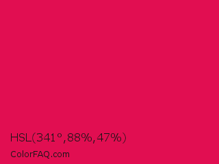 HSL 341°,88%,47% Color is a normal rose color and the nearest color is Debian Red #d70a53. Hex code #e10e51 and RGB value is rgb(225,14,81). In RGB color space, this color is composed of 88% red, 5% green, 32% blue, In CMYK color space, this color is composed of 0% cyan, 94% magenta, 64% yellow , 12% black , In HSL color space, this color has a hue angle of 341° , 88% saturation and 47% lightness.