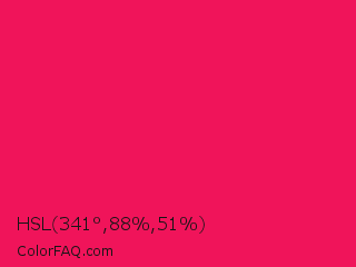HSL 341°,88%,51% Color is a normal rose color and the nearest color is Razzmatazz Crayola #e30b5c. Hex code #f0145a and RGB value is rgb(240,20,90). In RGB color space, this color is composed of 94% red, 8% green, 35% blue, In CMYK color space, this color is composed of 0% cyan, 92% magenta, 63% yellow , 6% black , In HSL color space, this color has a hue angle of 341° , 88% saturation and 51% lightness.