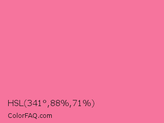 HSL 341°,88%,71% Color is a light rose color and the nearest color is Cyclamen #f56fa1. Hex code #f6749d and RGB value is rgb(246,116,157). In RGB color space, this color is composed of 96% red, 45% green, 62% blue, In CMYK color space, this color is composed of 0% cyan, 53% magenta, 36% yellow , 4% black , In HSL color space, this color has a hue angle of 341° , 88% saturation and 71% lightness.